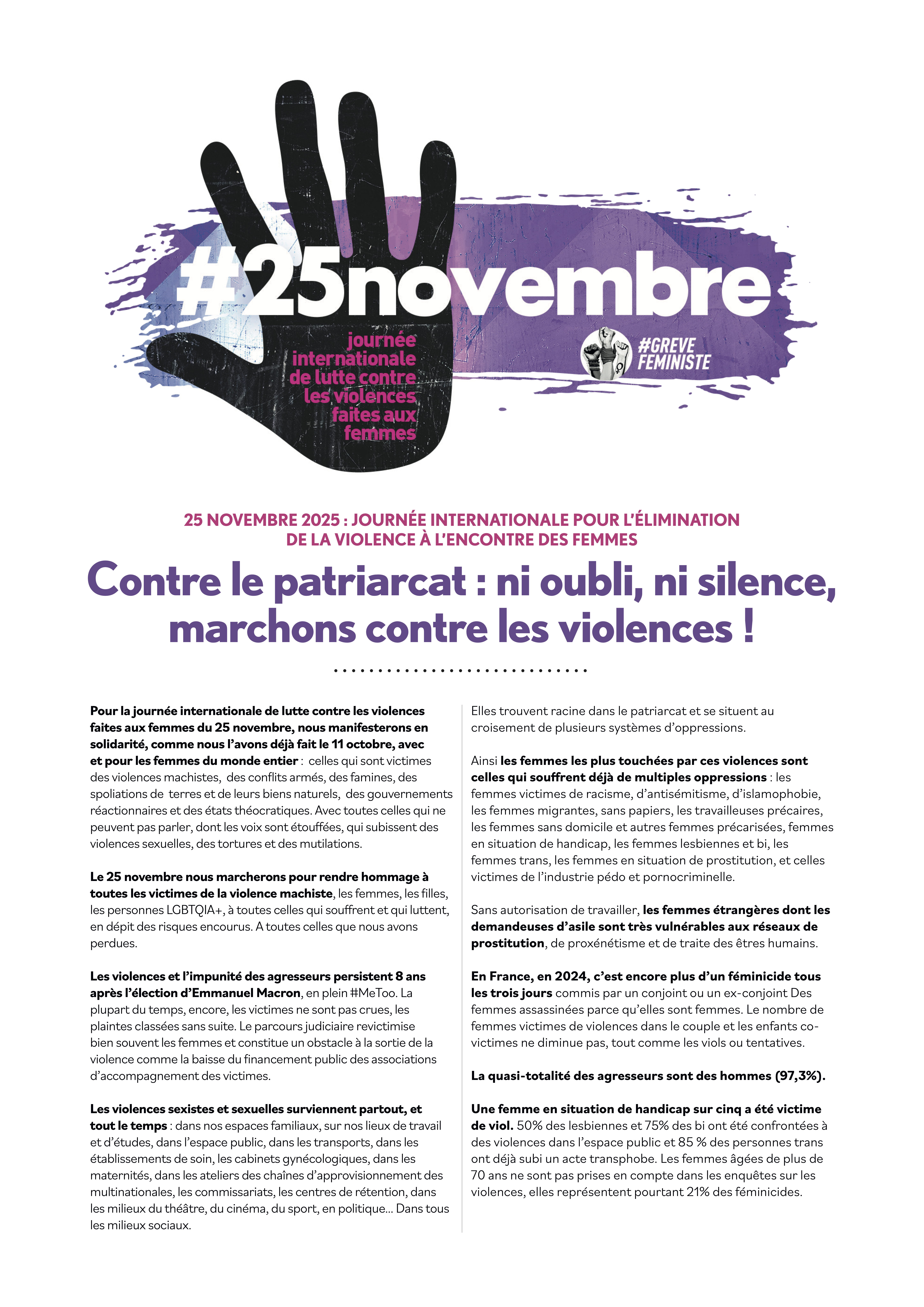Contre les violences faites aux femmes et aux filles, les violences sexistes et sexuelles, manifestons partout le samedi 22 novembre 2025 et le mardi 25 novembre 2025 !