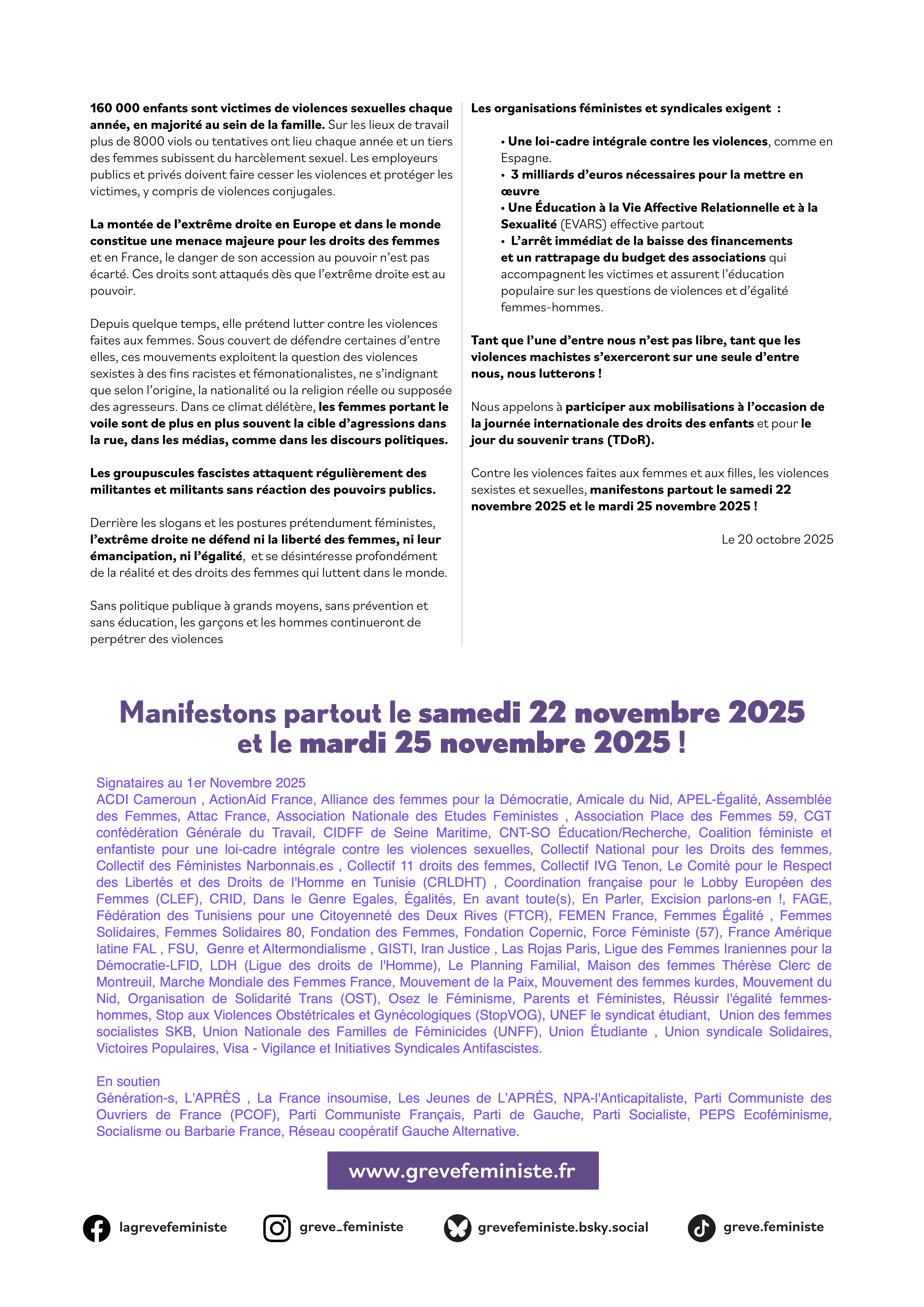 ACDI Cameroun , ActionAid France, Alliance des femmes pour la Démocratie, Amicale du Nid, APEL-Égalité, Assemblée des Femmes, Attac France, Association Nationale des Etudes Feministes , Association Place des Femmes 59, CGT CGT Confédération générale du travail confédération Générale du Travail, CIDFF de Seine Maritime, CNT CNT Confédération nationale du travail -SO Éducation/Recherche, Coalition féministe et enfantiste pour une loi-cadre intégrale contre les violences sexuelles, Collectif National pour les Droits des femmes, Collectif des Féministes Narbonnais.es , Collectif 11 droits des femmes, Collectif IVG Tenon, Le Comité pour le Respect des Libertés et des Droits de l’Homme en Tunisie (CRLDHT) , Coordination française pour le Lobby Européen des Femmes (CLEF), CRID, Dans le Genre Egales, Égalités, En avant toute(s), En Parler, Excision parlons-en !, FAGE, Fédération des Tunisiens pour une Citoyenneté des Deux Rives (FTCR), FEMEN France, Femmes Égalité , Femmes Solidaires, Femmes Solidaires 80, Fondation des Femmes, Fondation Copernic, Force Féministe (57), France Amérique latine FAL , FSU FSU Fédération Syndicale Unitaire , Genre et Altermondialisme , GISTI, Iran Justice , Las Rojas Paris, Ligue des Femmes Iraniennes pour la Démocratie-LFID, LDH (Ligue des droits de l’Homme), Le Planning familial, Maison des femmes Thérèse Clerc de Montreuil, Marche Mondiale des Femmes France, Mouvement de la Paix, Mouvement des femmes kurdes, Mouvement du Nid, Organisation de Solidarité Trans (OST), Osez le Féminisme, Parents et Féministes, Réussir l’égalité femmes-hommes, Stop aux Violences Obstétricales et Gynécologiques (StopVOG), UNEF UNEF Union nationale des étudiants de France le syndicat étudiant, Union des femmes socialistes SKB, Union Nationale des Familles de Féminicides (UNFF), Union Étudiante , Union syndicale Solidaires, Victoires Populaires, Visa – Vigilance et Initiatives Syndicales Antifascistes.