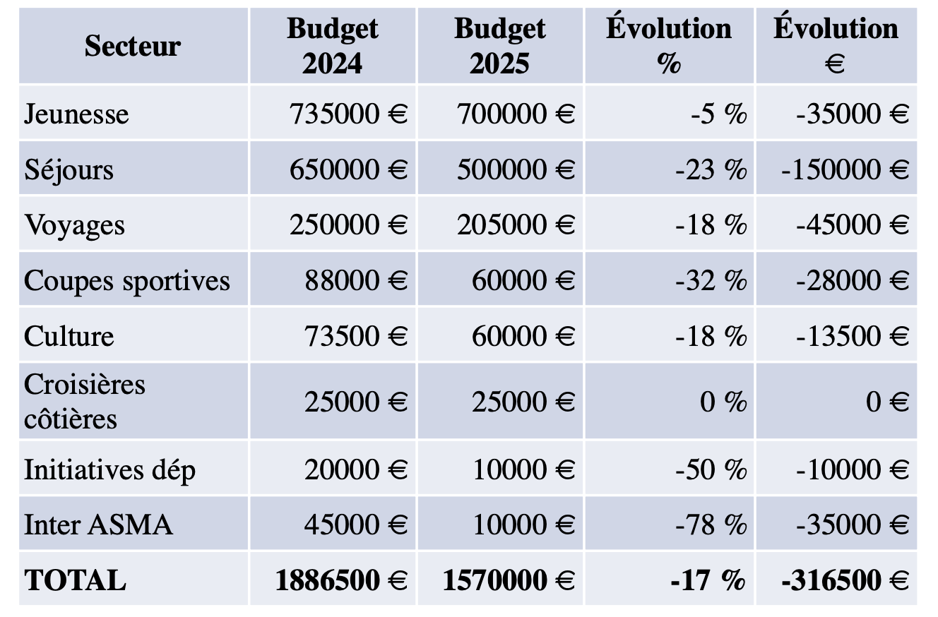 À titre d’exemple, pour le seul secteur des séjours, qui représente à lui seul 76 % des départs en vacances de l’ASMA, le budget présente une baisse de 23 % (150 000 €). Selon une première estimation, 1 500 ayants droit ne pourront plus partir avec l’ASMA en 2025 !