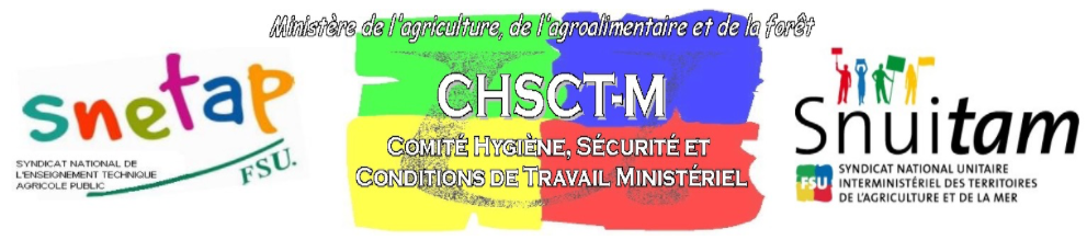 Le CHSCT CHSCT Comité Hygiène Sécurité et Conditions de Travail Ministériel du MAAF MAAF Ministère de l’agriculture, de l’agroalimentaire et de la forêt présidé par Patrick Soler s’est déroulé en visioconférence.